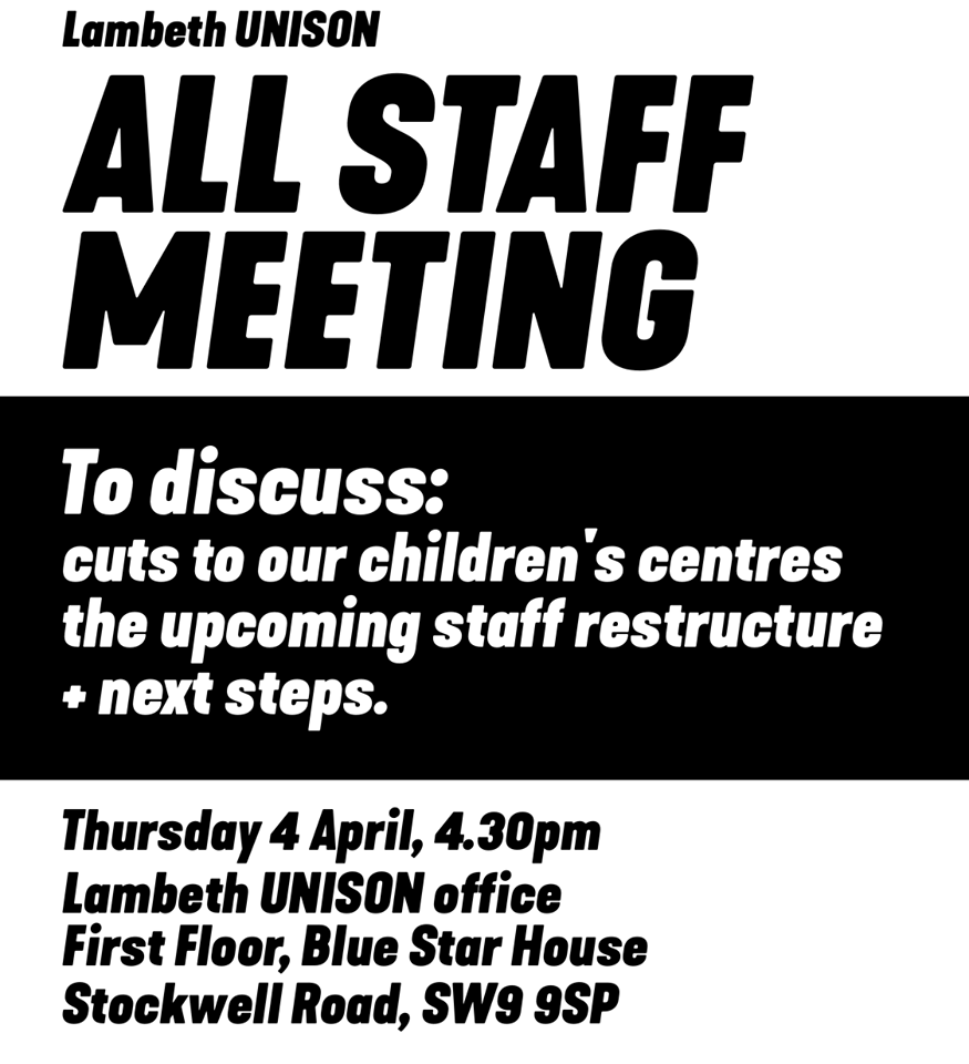Lambeth UNISON invites you to attend our ALL STAFF MEETING, where we will be discussing the proposed cuts to Lambeth’s children centres, the upcoming staff meeting and next steps.