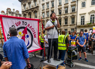 Roger Lewis speaking at an anti-racist demonstration and Hitesh Patel with Hassina Malik on strike over pensions