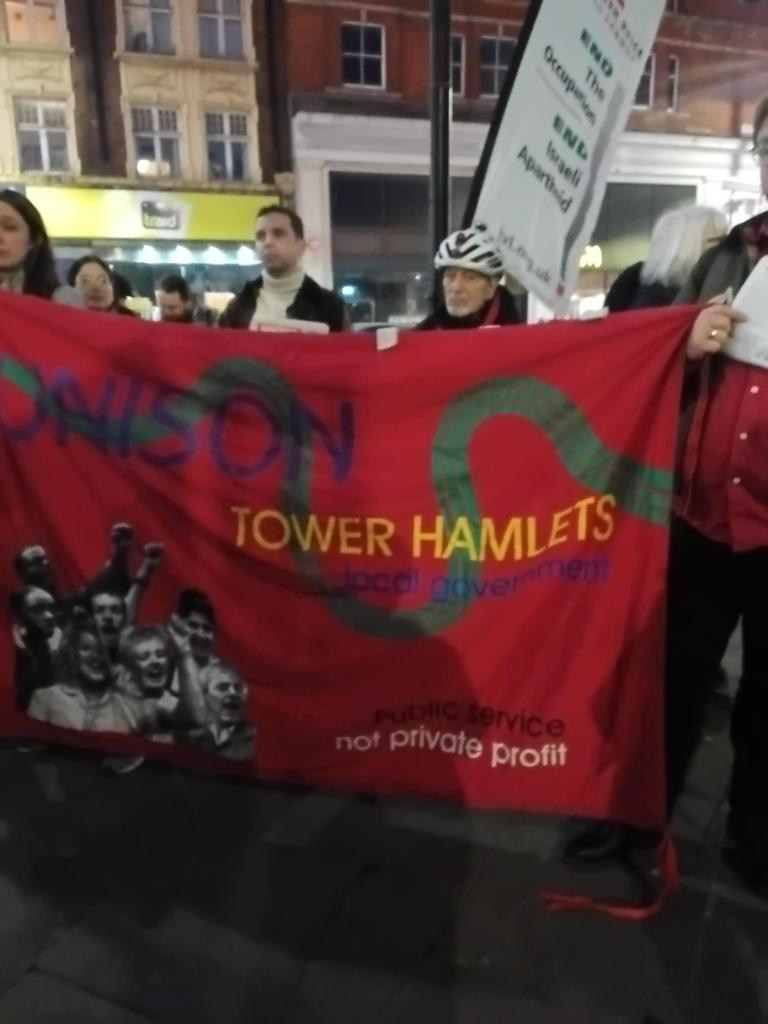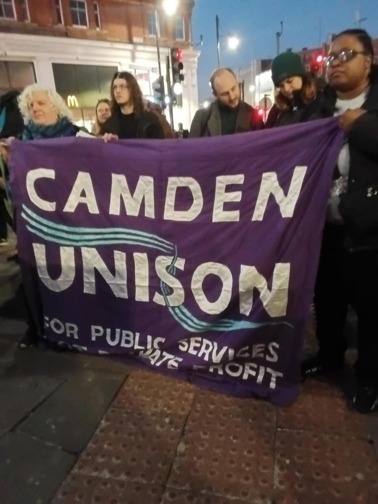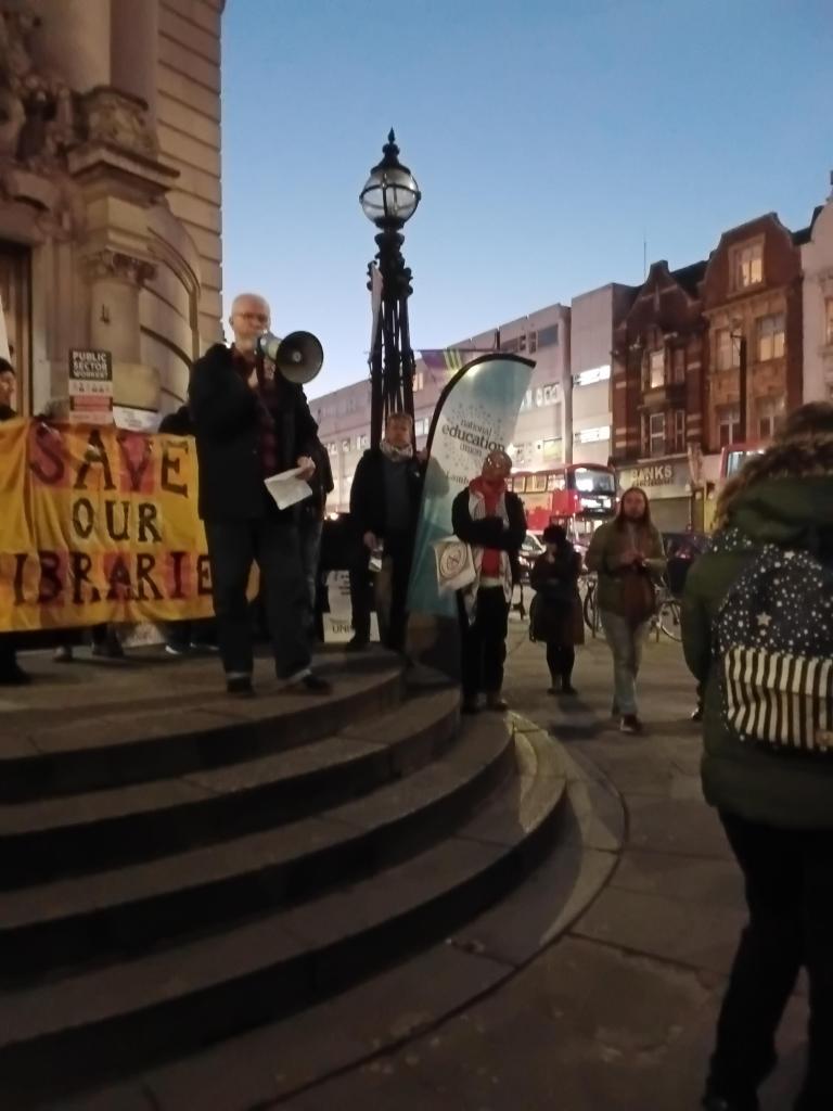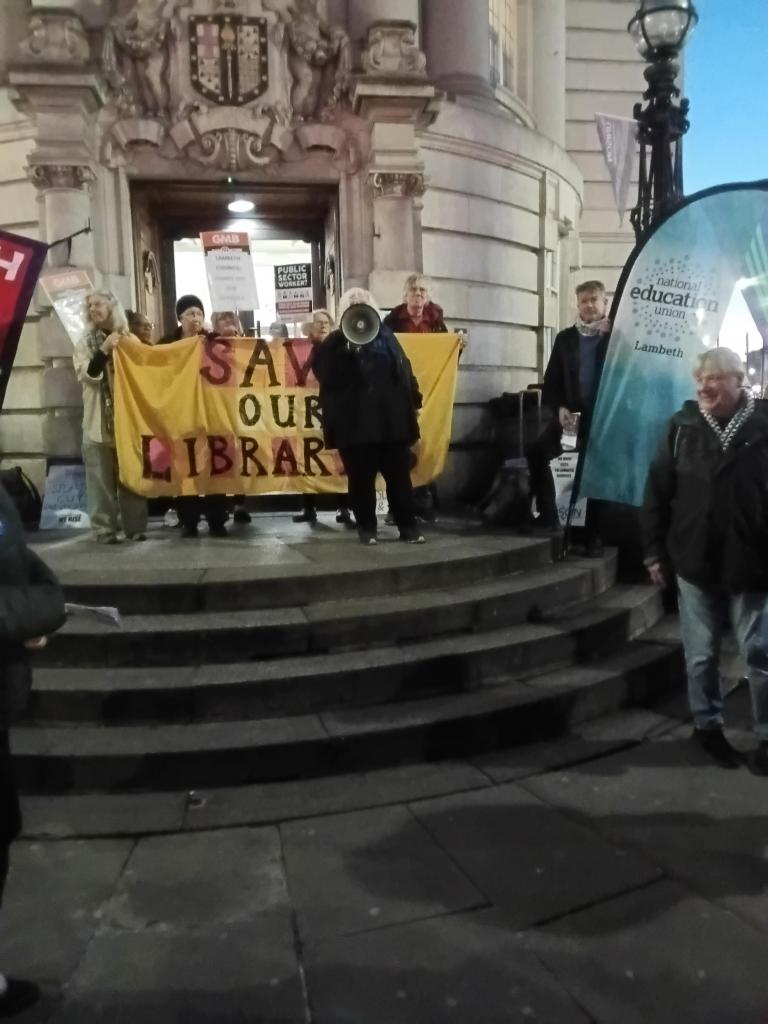 The protest included local residents, Friends of Lambeth Libraries, UNISON activists from Camden, Islington and Tower Hamlets, as well as the NEU (teachers union) and GMB.
